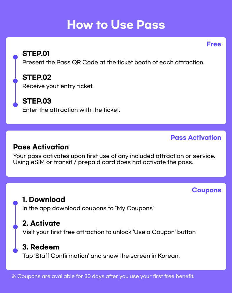 3. This card becomes active immediately and the countdown starts after visiting the first attraction(Including use of AREX train and Ttareungi bike).