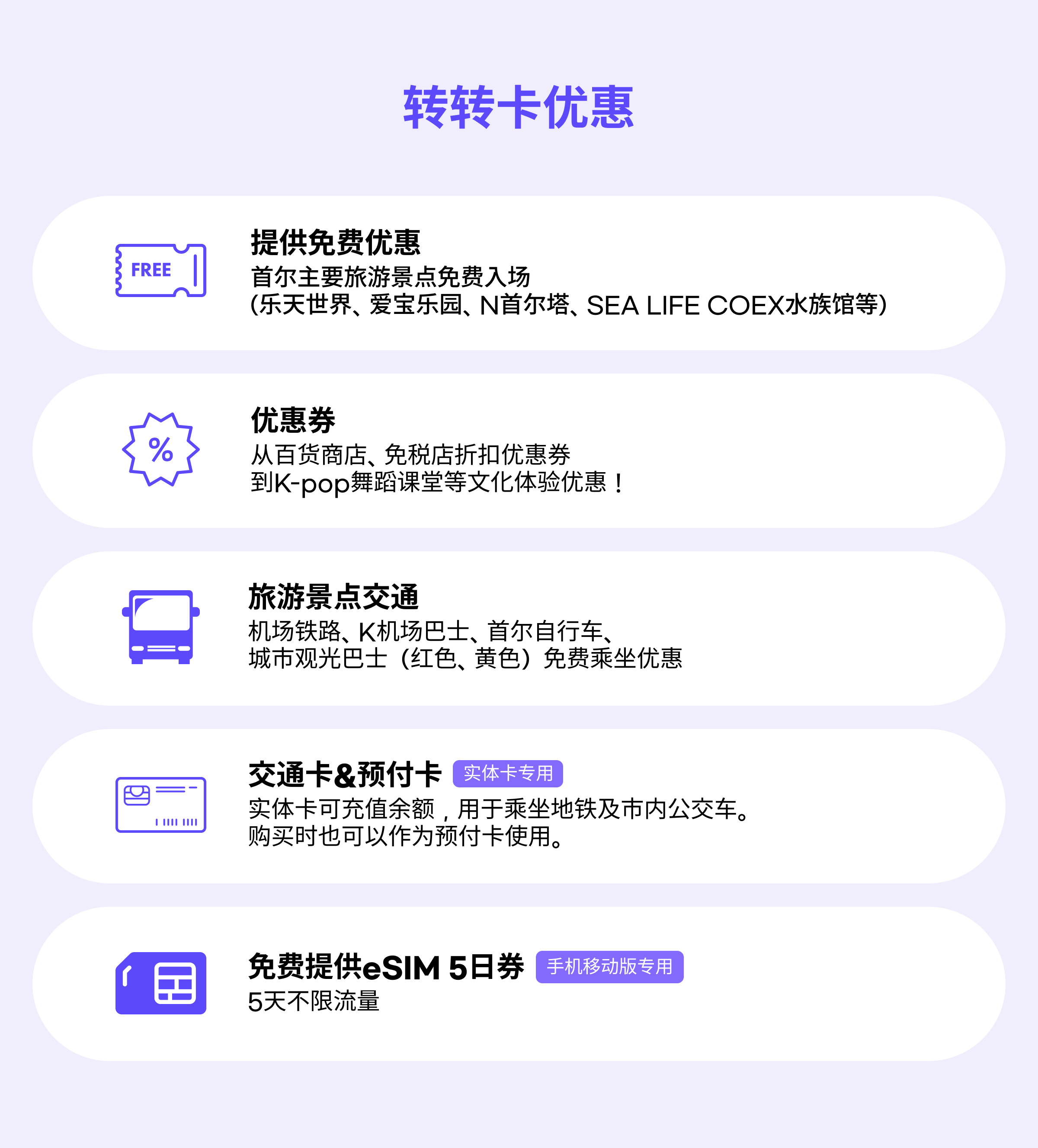 - 3. 免费乘坐机场快线(AREX)、首尔公共自行车(Ttareungi)、机场巴士(K-Limousine)和市内观光巴士。