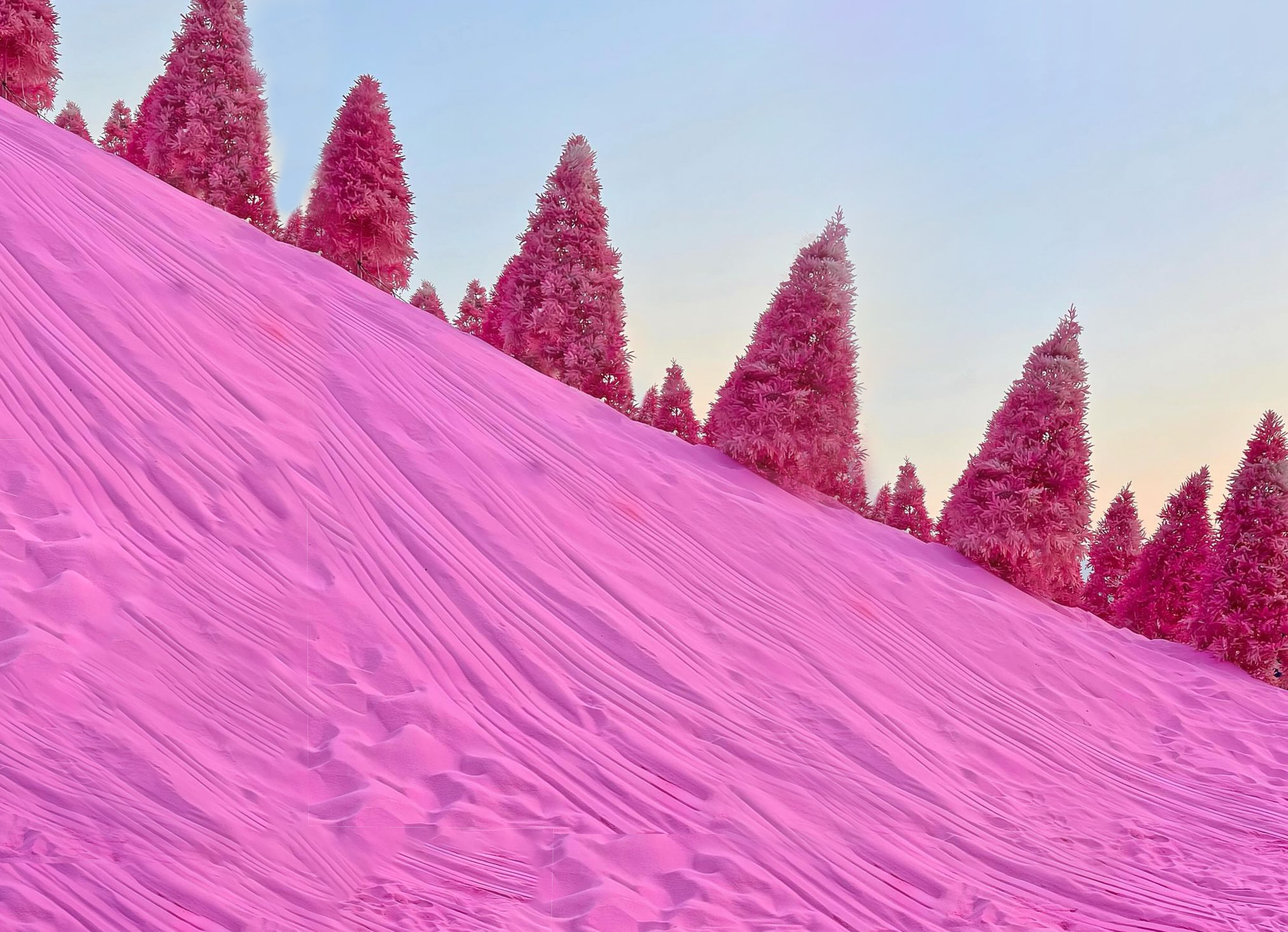 秋天可以乘坐粉色muhly,夏天可以在美丽的粉红色森林乘坐粉色雪橇拍摄帅气的照片。