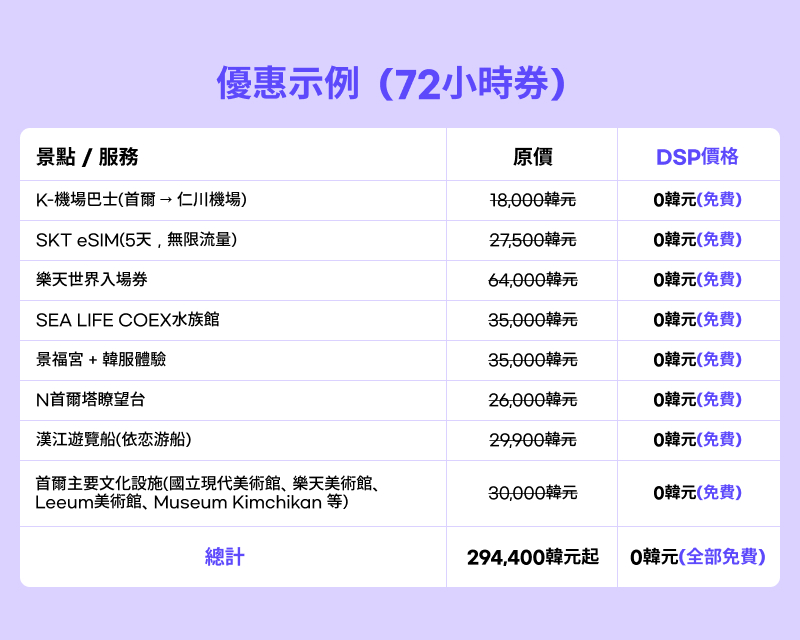 5. 請確認根據文化日(每月最後一週星期三(2016年標準)等政府政策,故宮/美術館等免費入場,年齡(65週歲以上等)免費入場優惠等,有效利用通行證。